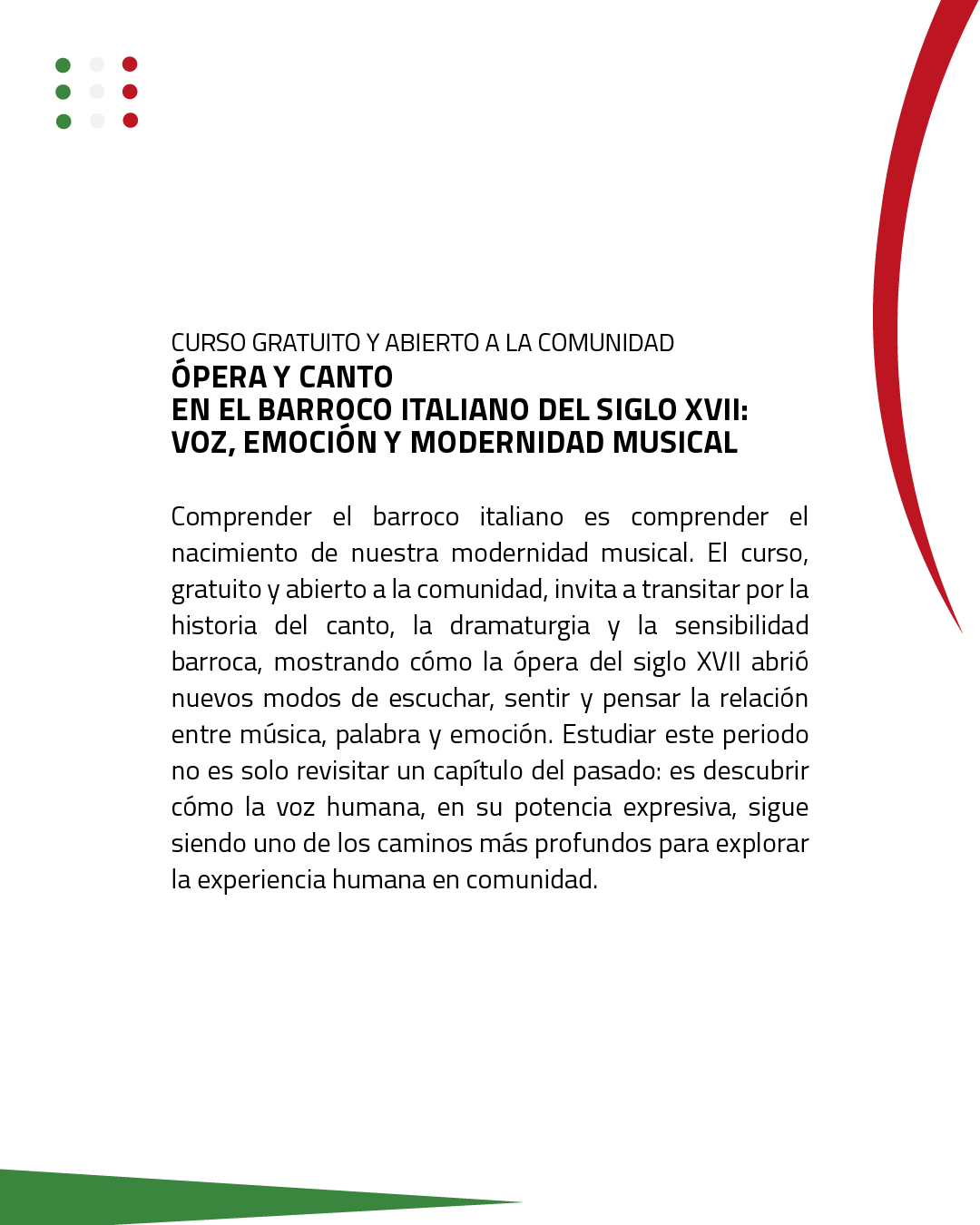 Explorar cómo la ópera barroca italiana convirtió a la voz humana en un medio privilegiado para transmitir emoción, narrativa y reflexión, generando nuevas formas de experiencia comunitaria, teatralidad y autoconocimiento. Esta sesión reflexiona sobre el impacto cultural y estético de estas transformaciones y sobre el legado perdurable del barroco en nuestra manera contemporánea de comprender la ópera y el canto.