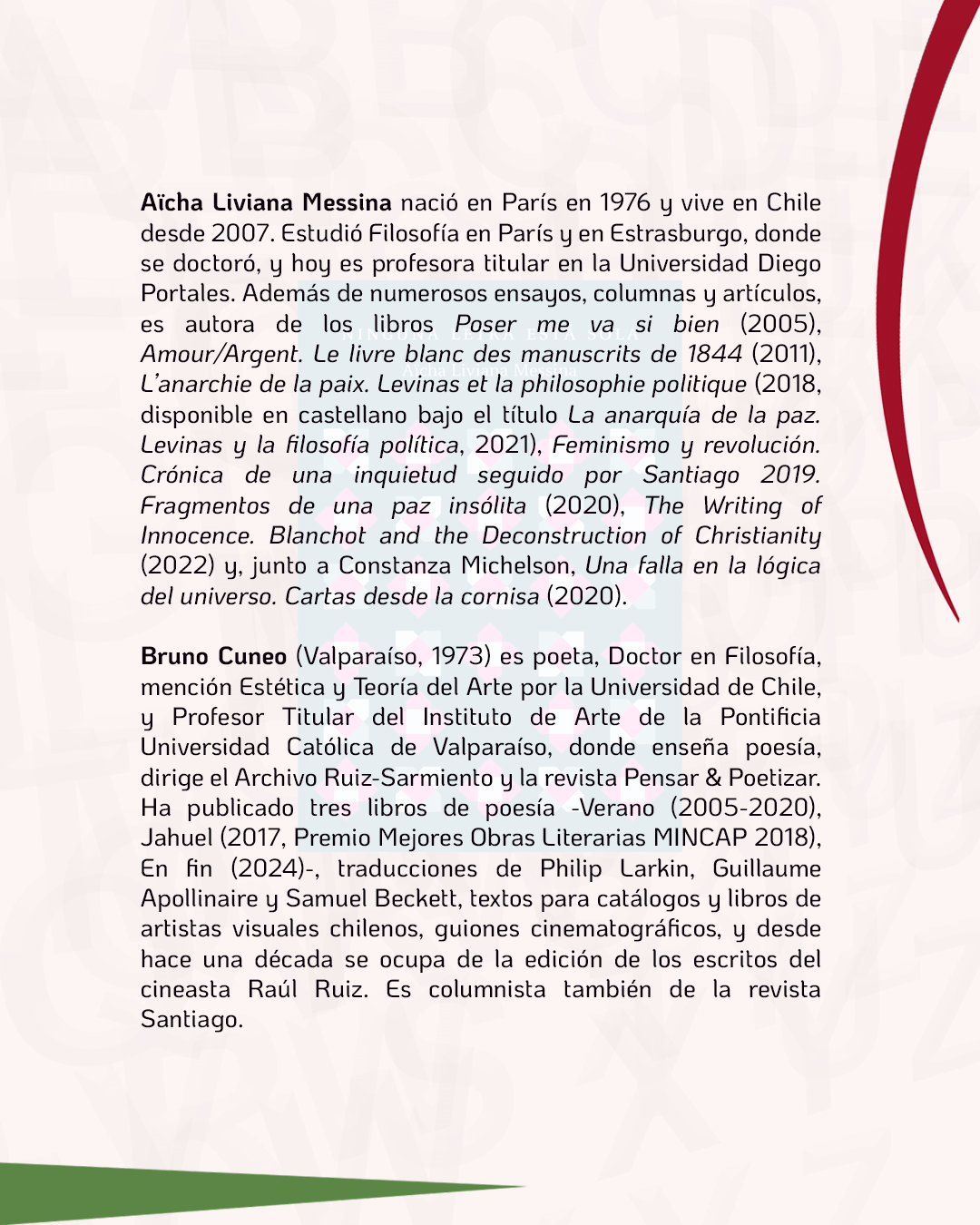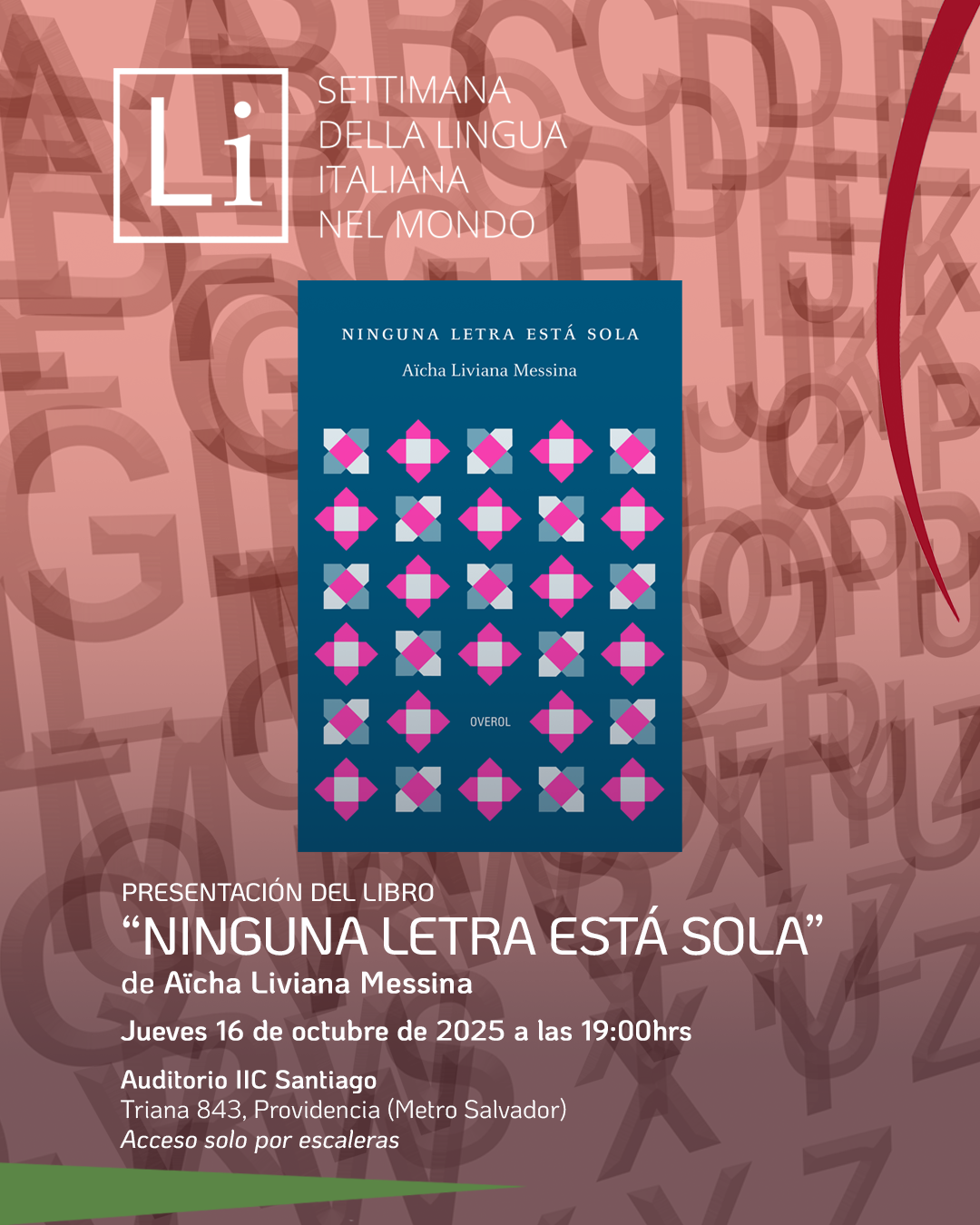 El Istituto Italiano di Cultura de Santiago invita a la presentación del libro Ninguna letra está sola (Overol, 2025). La autora, Aïcha Liviana Messina, filósofa con raíces en Francia e Italia, participará en una conversación con el escritor, poeta y docente Bruno Cuneo, explorando las temáticas centrales de su obra y su vínculo con la cultura y la lengua italiana.