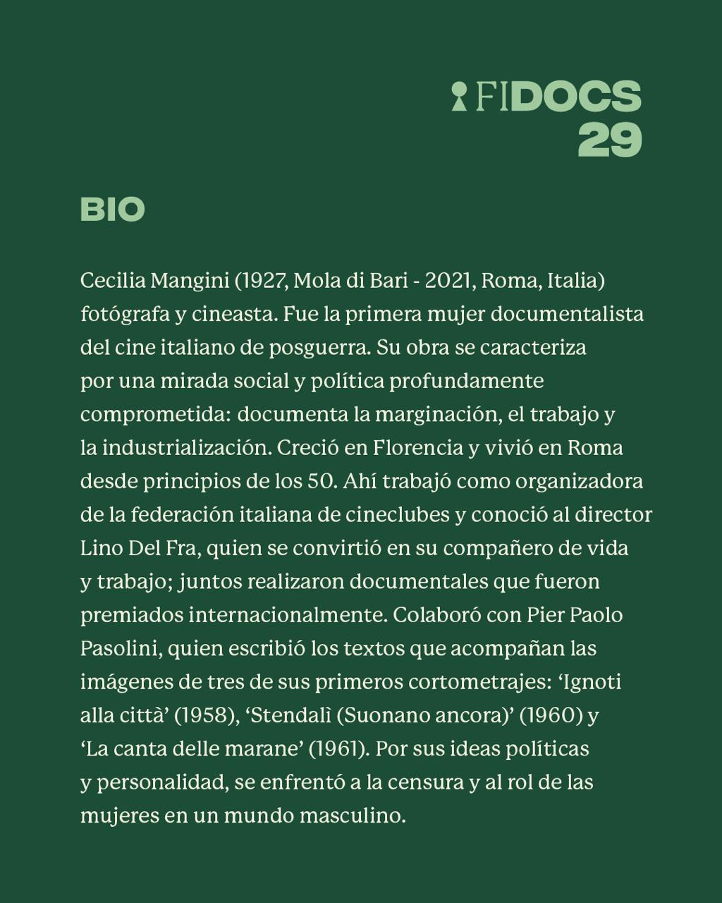Cecilia Mangini (1927, Mola di Bari – 2021, Roma) fu fotografa e cineasta. È stata la prima donna documentarista del cinema italiano del dopoguerra. La sua opera si caratterizza per uno sguardo sociale e politico profondamente impegnato: documenta l’emarginazione, il lavoro e l’industrializzazione. Crebbe a Firenze e visse a Roma dagli inizi degli anni Cinquanta. Qui lavorò come organizzatrice della Federazione italiana dei cineclub e conobbe il regista Lino Del Fra, che divenne suo compagno di vita e di lavoro; insieme realizzarono documentari premiati a livello internazionale. Collaborò con Pier Paolo Pasolini, che scrisse i testi che accompagnano le immagini di tre dei suoi primi cortometraggi: Ignoti alla città (1958), Stendalì (Suonano ancora) (1960) e La canta delle marane (1961). Per le sue idee politiche e la sua personalità, si confrontò con la censura e con il ruolo delle donne in un mondo maschile.
