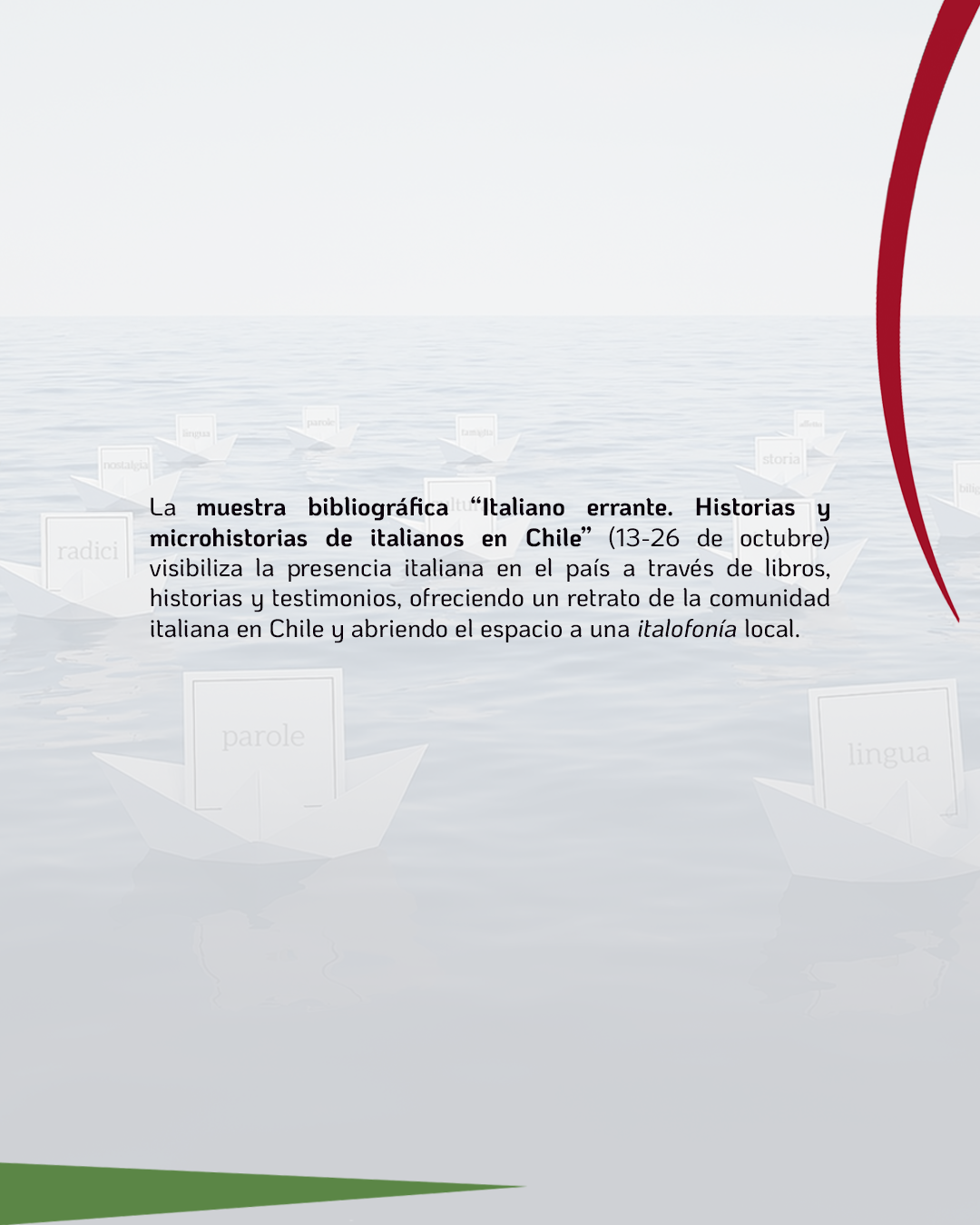 La mostra propone un percorso attraverso la presenza culturale e linguistica della comunità italiana in Cile, mettendo in dialogo la memoria storica e le forme attuali dell’italofonia.